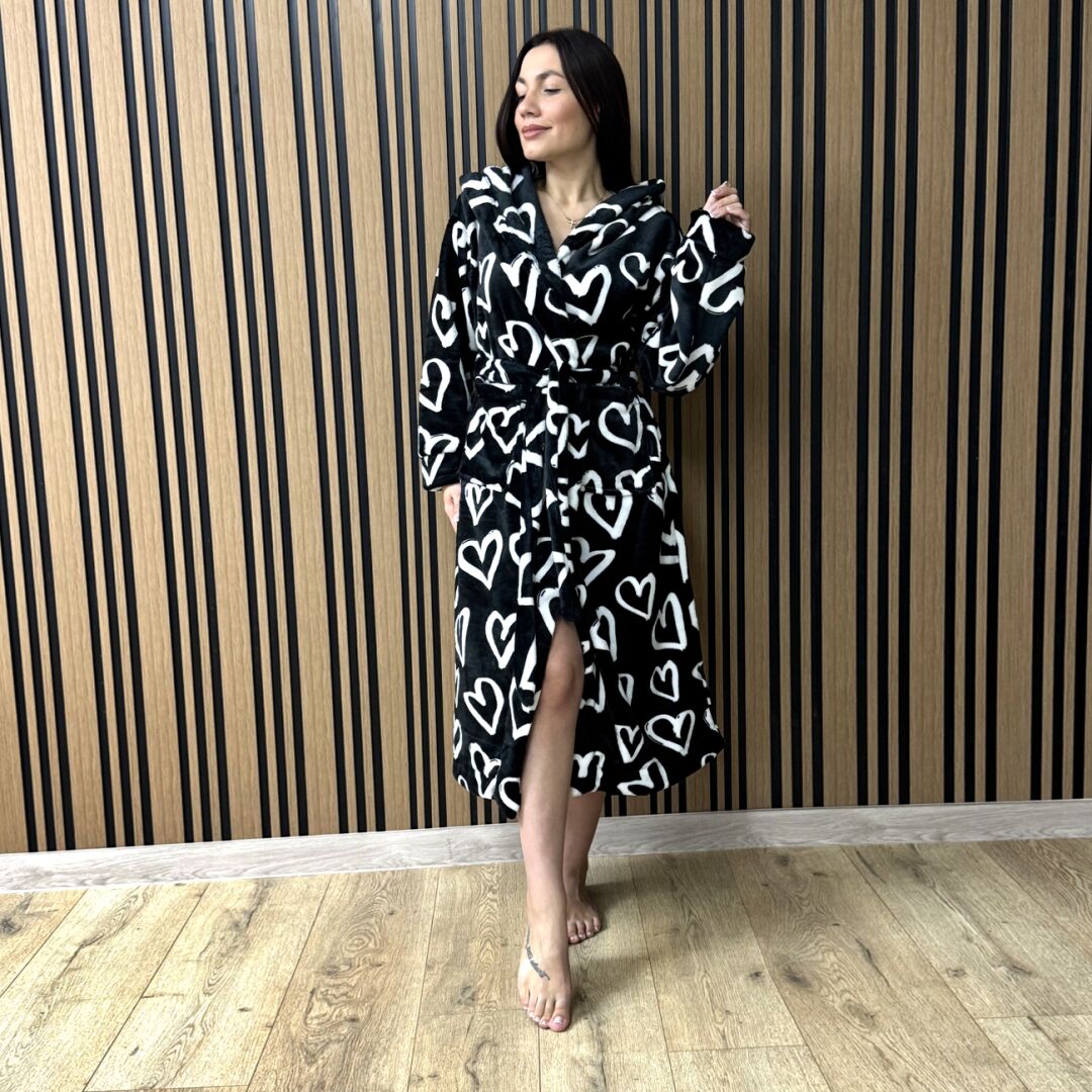 Теплий халат для дому – ваш комфорт та затишок кожного дня. В нього приємно загорнутися після насиченого дня. Виріб теплий, м’який та дуже приємний на дотик. Виконаний у довгому крої нижче коліна, з капюшоном там кишенями.