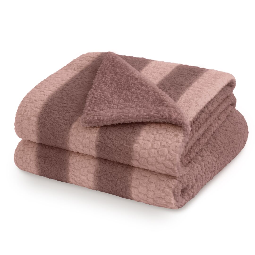 Це двосторонній плед шерпа зі смужками, який має м'яку флісову текстуру з одного боку та пухнасту, схожу на овчину, підкладку шерпа з іншого.
