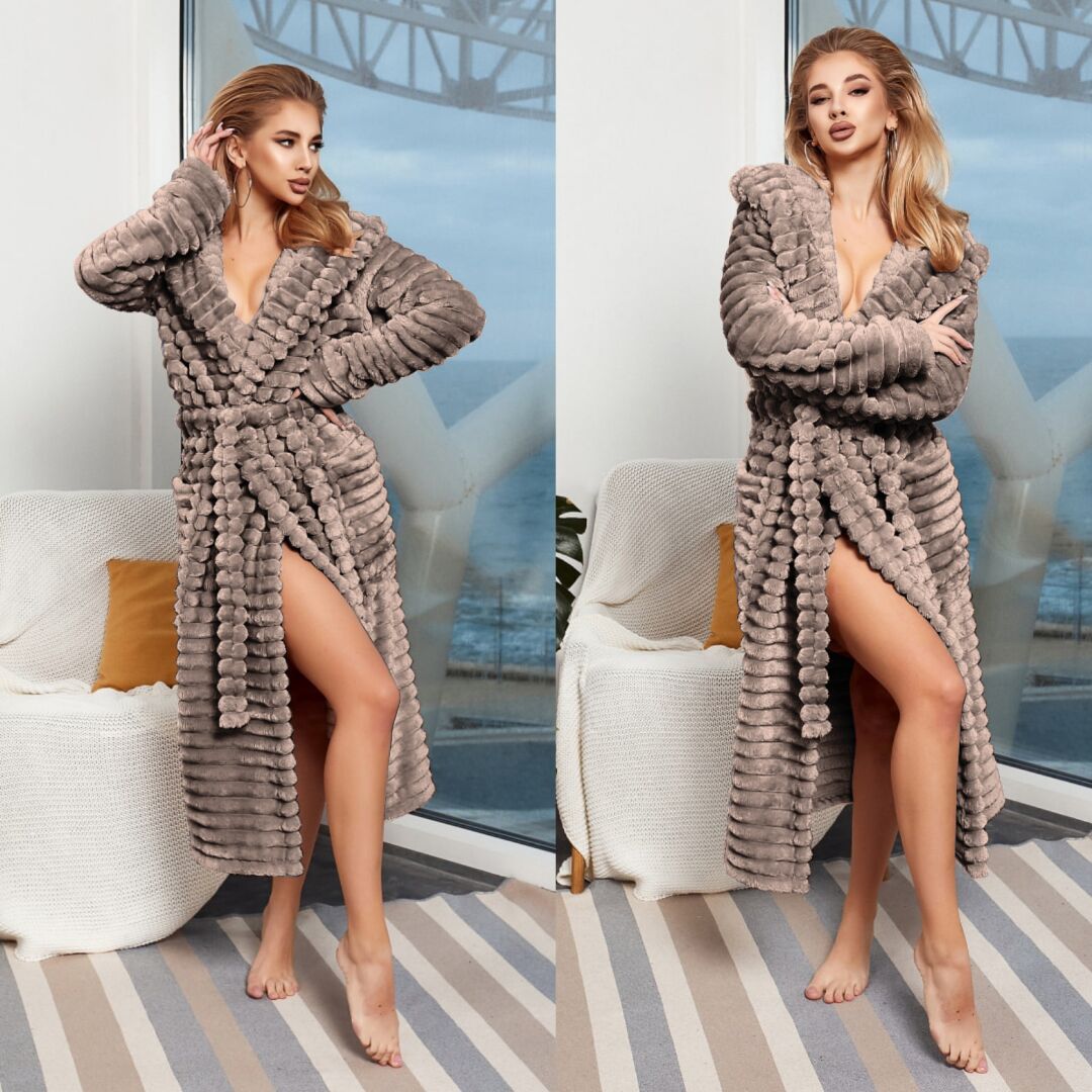 Данное изделие является незаменимым на месте. Ведь он комфортен, тепл и удобен в использовании. Сам дизайн элегантный и стильный, поэтому его обладательница будет выглядеть бесподобной дома. В основе изделия высококачественная турецкая бахрома премиум качества. Благодаря которой халат является натуральным, не вызывает аллергии, легко стирается, и главное – не теряет свой первоочередной вид с годами. Такой халат обязательно станет приятным подарком.