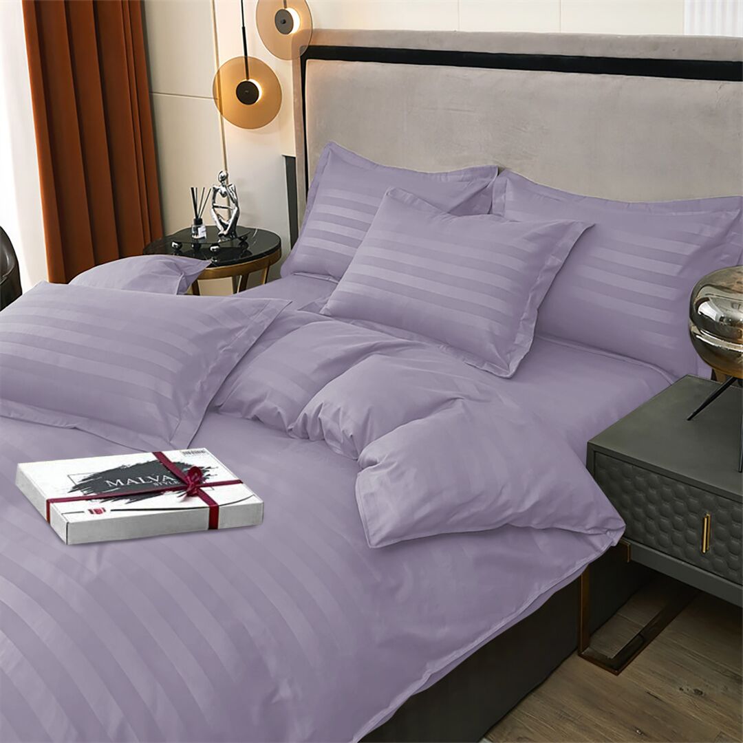 Комплектация постельного белья очень удобна: эта простыня на резинке, рассчитанная на высоту бортика матраса до 25см. (кстати, очень легко надевается и на широкий диван), две наволочки размером 70*70 на запах и сшитые в дизайне «бортик-ушки», а также пододеяльник на молнии.